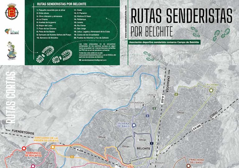 Planifica tus rutas con este mapa detallado de senderos y recorridos por Belchite y su entorno. Incluye itinerarios señalizados, puntos de interés y propuestas para descubrir el paisaje y el patrimonio natural.